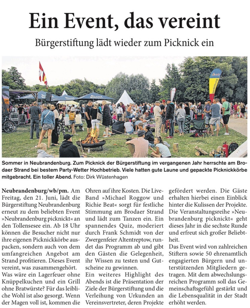 Zu "Neubrandenburg picknickt" am Freitag, dem 21.Juni ab 18:00 Uhr erwarten die Aktiven der BürgerSiftung Neubrandenburg am Brodaer Strand wieder mehrere hundert Besucher. Dank der Spenden von Stifterehepaaren und der Dr. Netik und Partner GmbH, einer Förderung durch die Partnerschaft für Demokratie Neubrandenburg und der Unterstützung des Marktplatzcenter Neubrandenburg können die Teilnehmenden sich in diesem Jahr auf einige Überraschungen freuen.