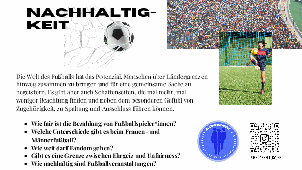 Unter diesem Titel sollen im laufenden Schuljahr 8-12-jährigen Kindern der 5.-8. Klassen an verschiedenen weiterführenden Schulen Neubrandenburgs ein Einblick in die vielseitigen Facetten der Fußballwelt gegeben werden. Mit Rückblick auf die im vergangenen Sommer in Deutschland ausgerichtete Fußball-Weltmeisterschaft ist die erlebte Faszination bei Kindern und Jugendlichen eine gute Grundlage für die angestrebten Gespräche. Das Anliegen des von der BürgerStiftung Neubrandenburg geförderten Projektes ist es, die Teilnehmenden für die Vielfalt des Themas zu sensibilisieren, einen respektvollen Austausch zu fördern und die Teilhabe jedes Einzelnen an der Gesellschaft zu verdeutlichen. Ein respektvoller Austausch sowie die Entwicklung von Medien- und Diskurskompetenz sollte und hat bei Nutzung verschiedener Medien und Methoden zur Veranschaulichung von Inhalten den Schülern auch Freiraum für eigene Themen und Anregungen gegeben.