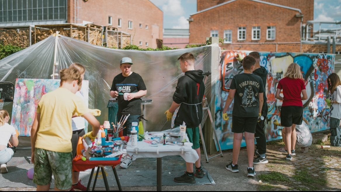 Am 25. August hatten in diesem Jahr 10 Kinder und Jugendliche am Graffiti-Projekt, das vom Künstler Paul Raddatz initiiert und organisiert worden war, teilgenommen. Thematisiert worden waren die Unterschiede zwischen Graffiti als Vandalismus bzw. Graffiti als Kunstform. Die Teilnehmenden haben den Umgang mit der Sprühdose, dem Handwerkszeug eines Graffiti-Künstlers, kennengelernt. Informationen zu den Inhalten und Gefahren wurden besprochen und Meinungen in offenen Gesprächen ausgetauscht. In zwei Stationen waren gruppenweise einerseits Gebäudewände in Graffiti "erprobt" und andererseits Leinwände "bearbeitet" worden. Die Leinwände und Flächen waren technisch und experimentell gestaltet worden. Jeder durfte seine eigens gestaltete Leinwand mit nach Hause nehmen.