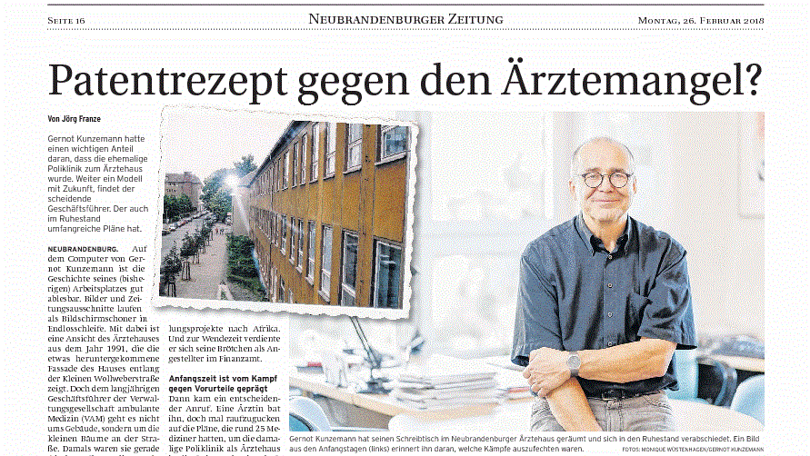 Über 70 Gäste, Mitstreiter, Wegbegleiter und Freunde waren am Sonntagvormittag gekommen, um mit Gernot Kunzemann zu feiern und ihm für seinen Einsatz um die Entwicklung des Ärztehauses sowie für sein gesellschaftliches Engagement zu danken. Viel Anerkennung wurde zum Ausdruck gebracht, auch die insgesamt zusammengekommene Spende von 2.650 Euro für die BürgerStiftung Neubrandenburg ist ein deutlicher Beleg für die persönliche Wertschätzung.