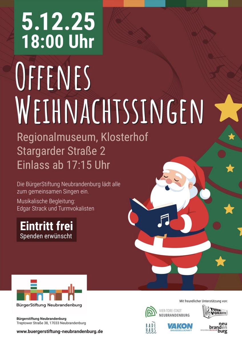 Am 5. Dezember um 18 Uhr sind alle Neubrandenburger und deren Gäste herzlich zum traditionellen Weihnachtssingen in den festlich erleuchteten Klosterhof des Regionalmuseums eingeladen.