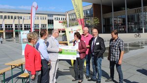 Auf dem Wochenmarkt erhalten Bürgerstiftler einen symbolischen Scheck zur Förderung ihres Projektes "Boot der Wünsche".